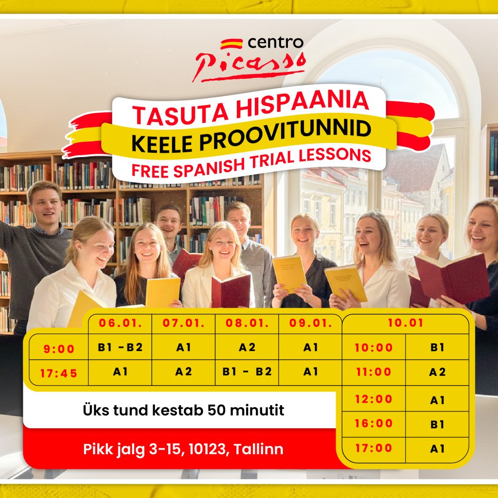 Tule proovitundi ja osale meie loteriis, kus auhindadeks on tasuta hispaania keele kursus septembrist detsembrini ning 5 Centro Picasso sõbrakaarti, millega saate allahindlusi Tallinna parimates Hispaania ja Ladina-Ameerika kohtades.